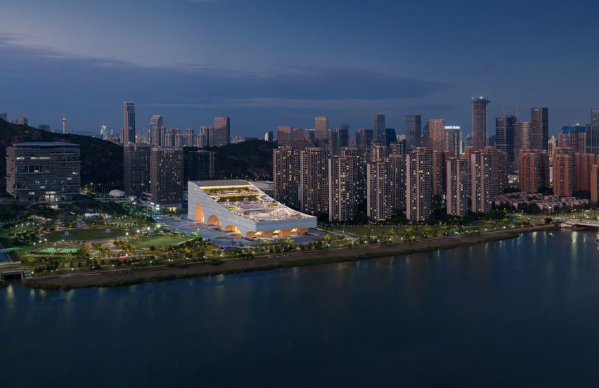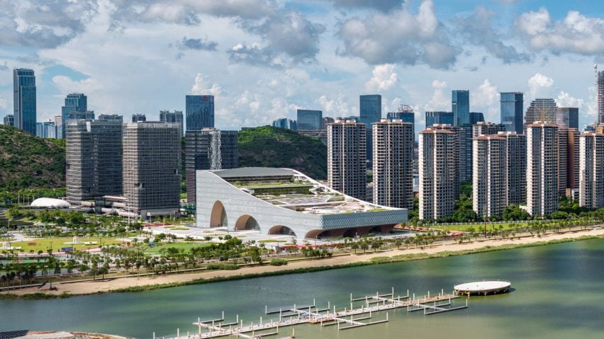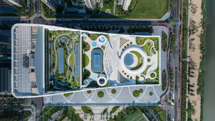 这座位于中国南方城市珠海的建筑占地142560平方米,包括一座图书馆、一座剧院和一座博物馆,其顶部均设有一个带露台的屋顶花园。