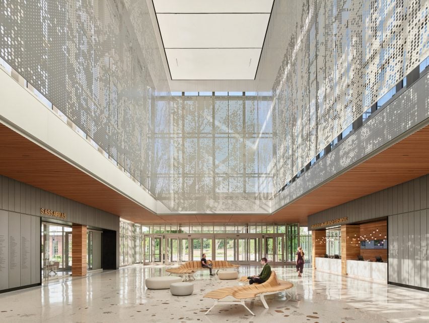 艾尔斯-圣格罗斯工作室说:“通过将斑驳的光线过滤到大厅,灯笼唤起了进入树林中空地的感觉。到了晚上,灯笼的光芒为游客和社区提供了灯塔。”