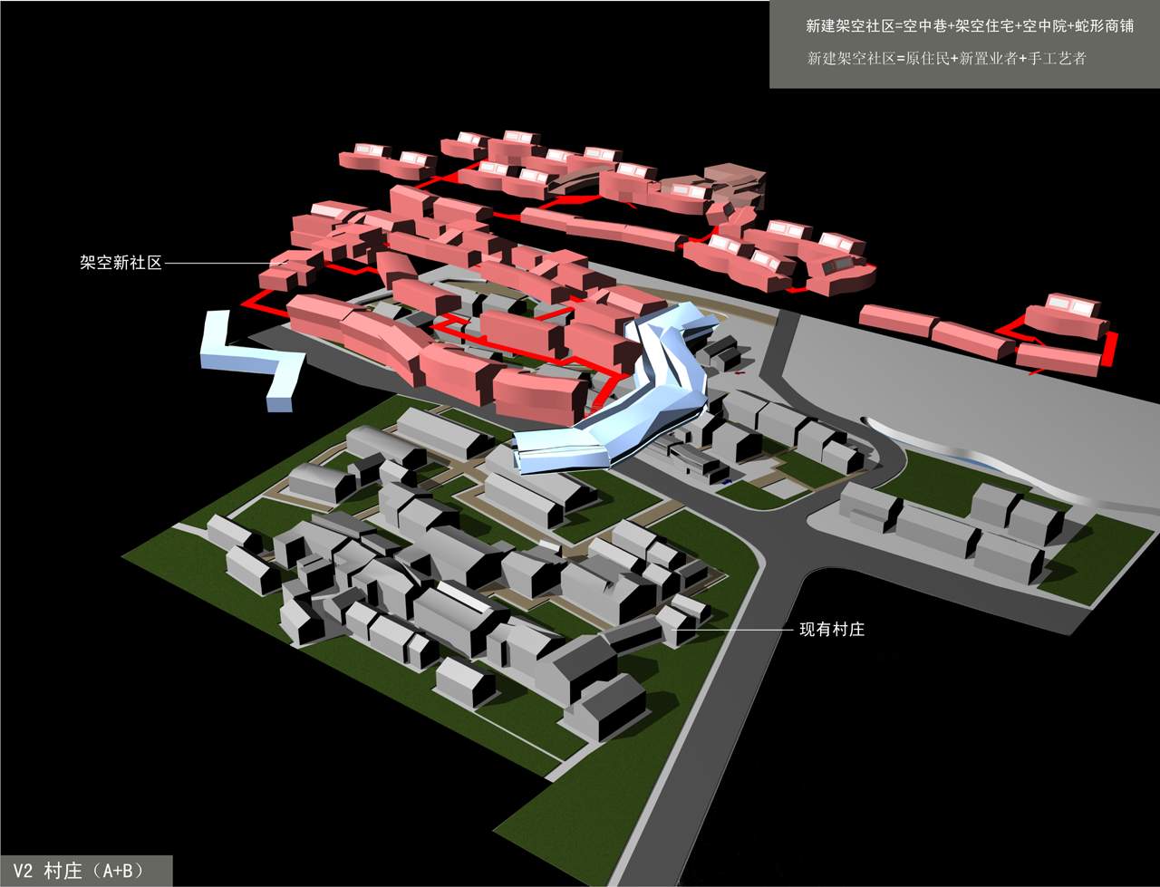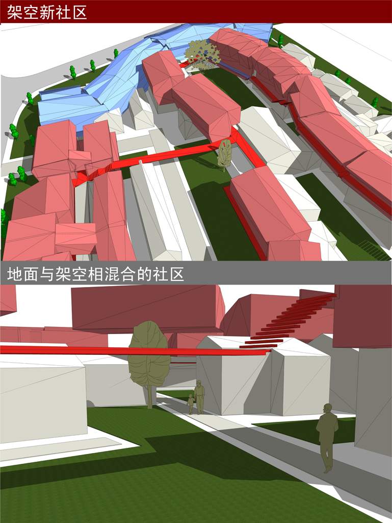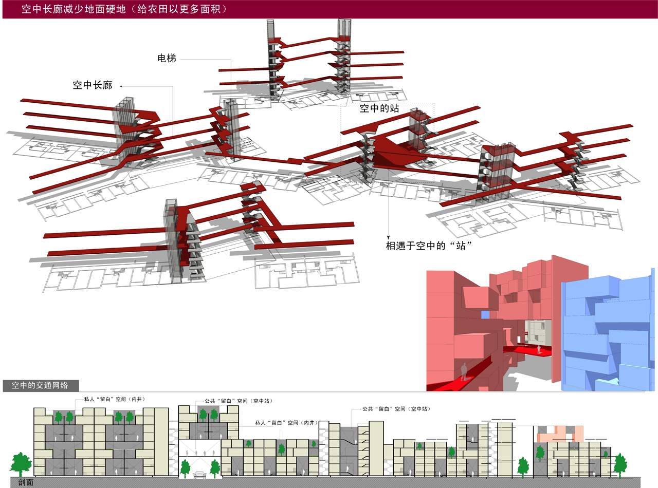 5、文脉及伦理首先方面的可持续发展:村落的保留及村落上部的“架空社区”都是原村庄骨架的“再生”。架空的新住宅是由“空中的巷”连接,它与下部村庄里的小巷是一种垂直的映象关系,且上部的“巷”可供人观赏四周或作短暂停留“空中的巷”之间的关系与下部村庄的巷很相同,“空中住宅”的构架仿佛是新版的村庄,但比原来的村庄更有生命力,所以居民们的生活空间是沿用及发展了现有村庄格局的,从中滋生出来的新空间本质上沿用了江南地区院落住宅的方式,只不过它是“浮”在空中的新建筑,更趋向自由。其次“空中楼阁”虽说是一连体建筑,但它们在南北方向又能形成了不同进深的“空中院落”,而每个“院落”的单体住宅内又有与下部村庄垂直向的关系。这样便产生了一种直观的上下沿继。