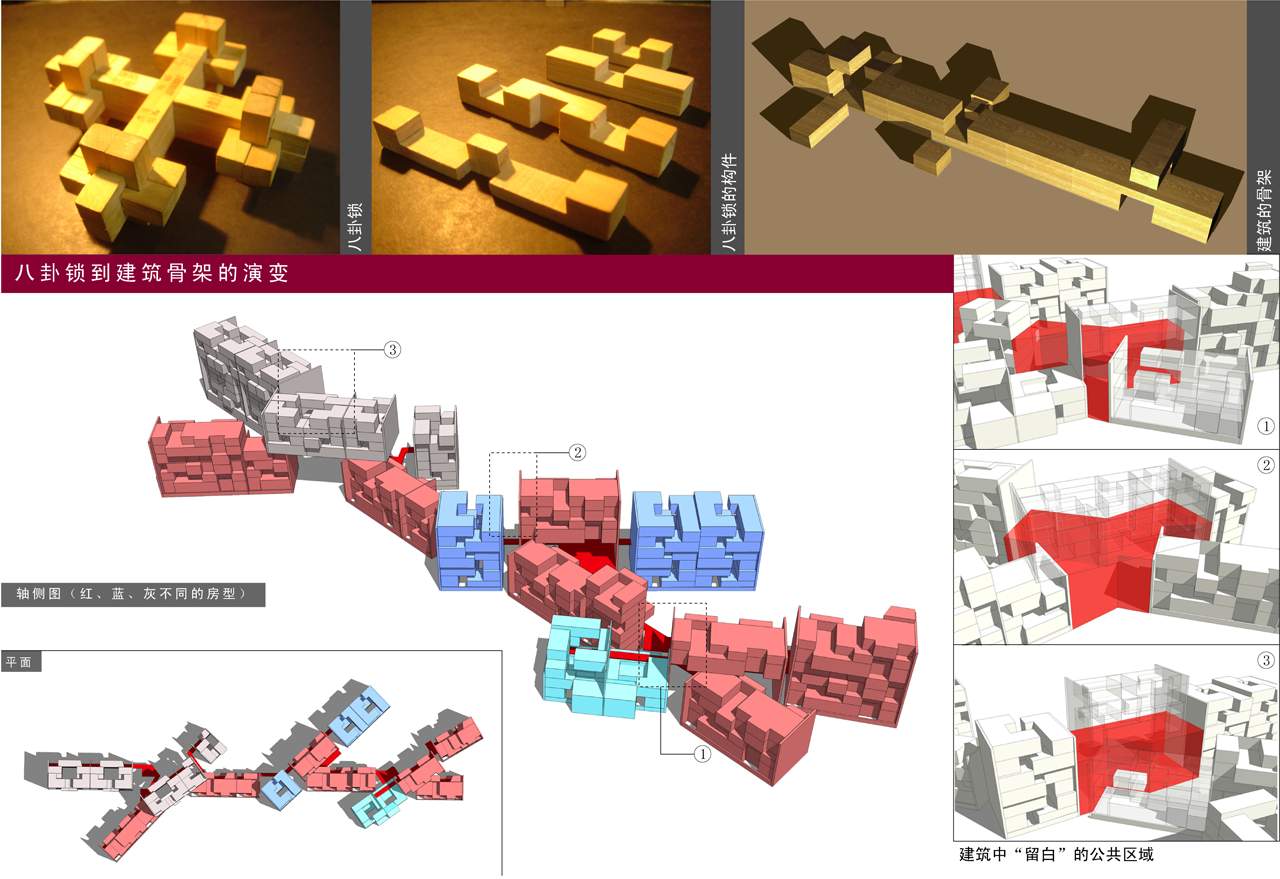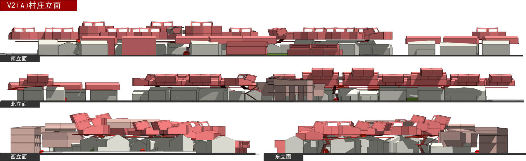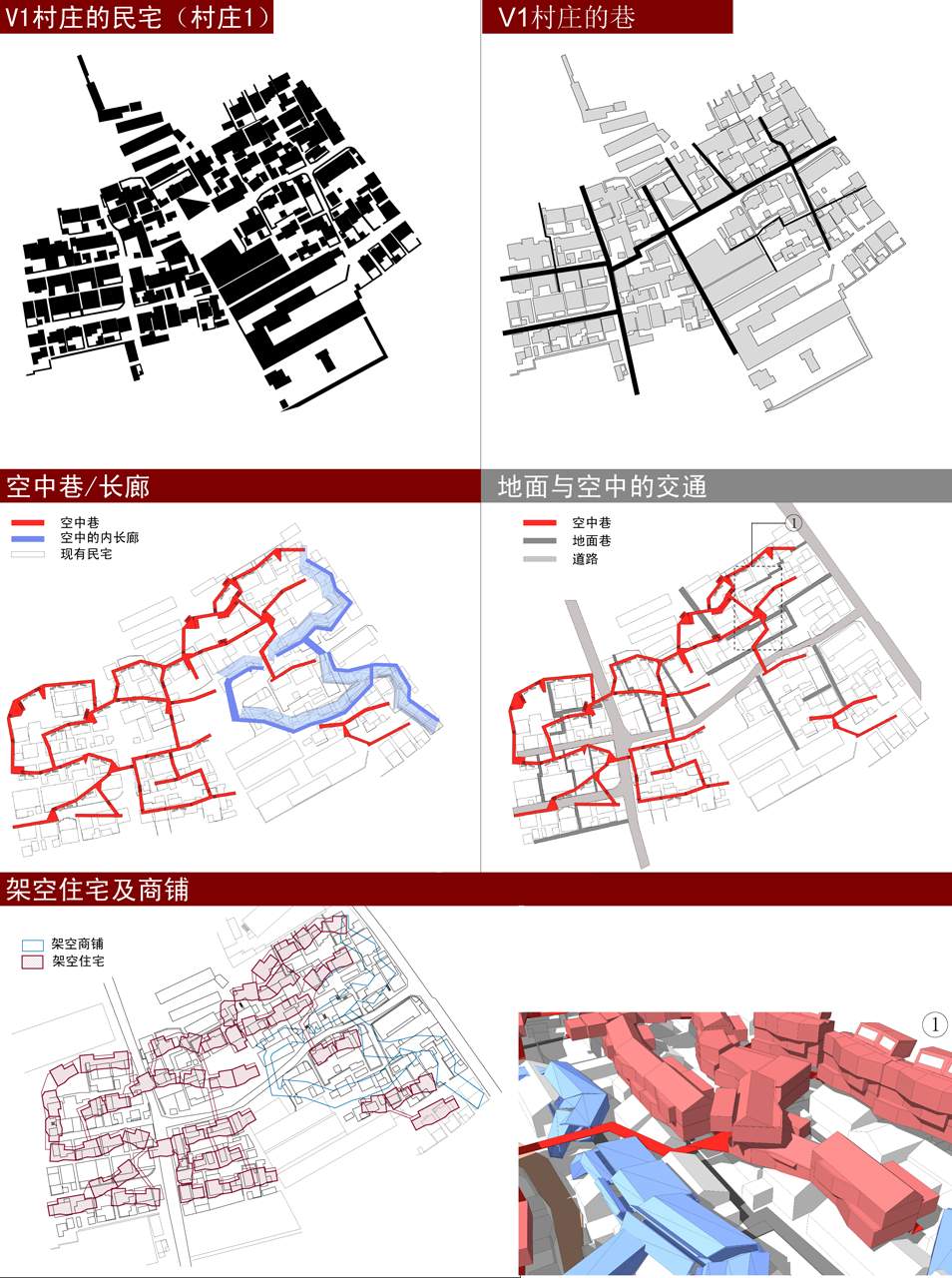 5、文脉及伦理首先方面的可持续发展:村落的保留及村落上部的“架空社区”都是原村庄骨架的“再生”。架空的新住宅是由“空中的巷”连接,它与下部村庄里的小巷是一种垂直的映象关系,且上部的“巷”可供人观赏四周或作短暂停留“空中的巷”之间的关系与下部村庄的巷很相同,“空中住宅”的构架仿佛是新版的村庄,但比原来的村庄更有生命力,所以居民们的生活空间是沿用及发展了现有村庄格局的,从中滋生出来的新空间本质上沿用了江南地区院落住宅的方式,只不过它是“浮”在空中的新建筑,更趋向自由。其次“空中楼阁”虽说是一连体建筑,但它们在南北方向又能形成了不同进深的“空中院落”,而每个“院落”的单体住宅内又有与下部村庄垂直向的关系。这样便产生了一种直观的上下沿继。