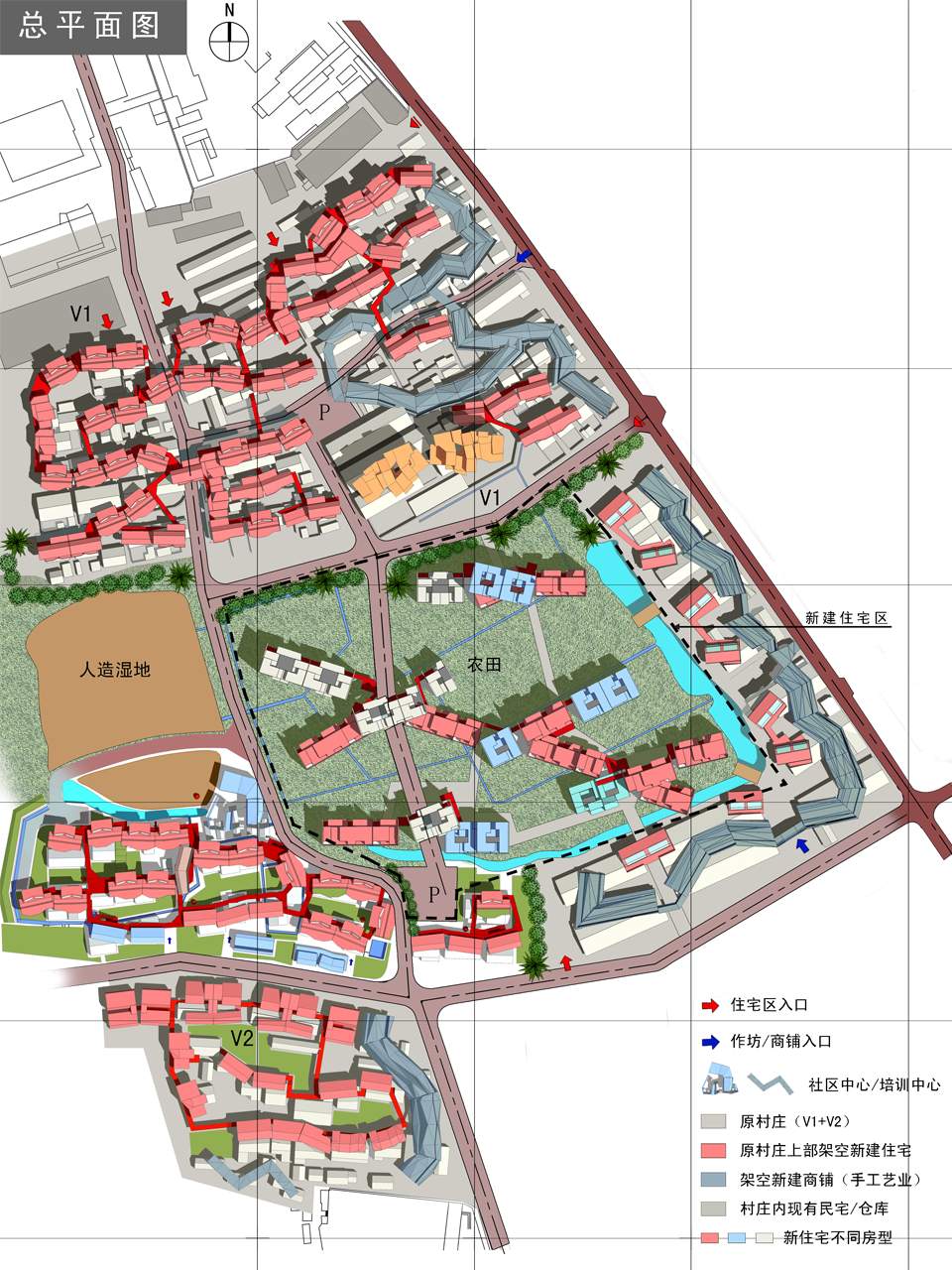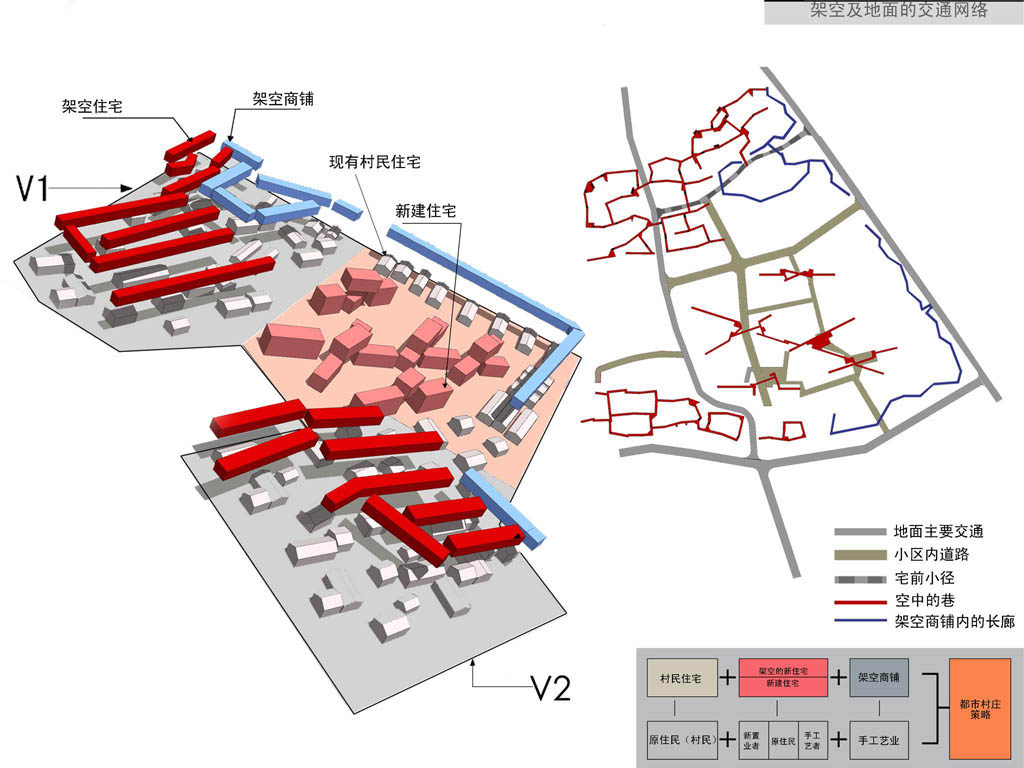 2、社会的混合性:将不同职业不同收入的社会阶层适当的混合,由于在整个社区的设计上保留了原有村庄的构架,这样便产生了村庄与村庄之间的空间,这些空间目前是少数的农田及垃圾堆放场或是些不明确场所,如图。在此空地上将建立新的住宅区,同时在原村落的上空以“高架社区”的方式新建“架空住宅层”,这样在平面及垂直方向都形成了原住民与新居民(置物者)的参差,成为一种立体的社区,而非现行的“封闭式小区”。原村庄里的村民与新置业者的空间关系决定了他们之间相互交融,这种在原村庄构架上的“架空住宅层”消除了“新”与“旧”,“贫民”与“置业者”一墙之隔,从空间构架上给不同阶层人群的共融提供了新的可能性。其次,这种“上层”与“下层”的关系并不是在形而上的意识形态模式,而是生动具体的新生事物——村民们保留着下部原住宅的使用产权,同时他们也可以购买架空的新住宅,同时新居民(置业者)也可以租用下部村庄的民宅开店,原住民照样可以收到租金(不同于现在72家房客的低租金)。其次提倡功能的适当混合,在虹中路将没有所谓“居住区”“集中购物区”等硬划分,而是主张“生活”一“劳动”/“工作”一体化(在新产业注入详细说明)。