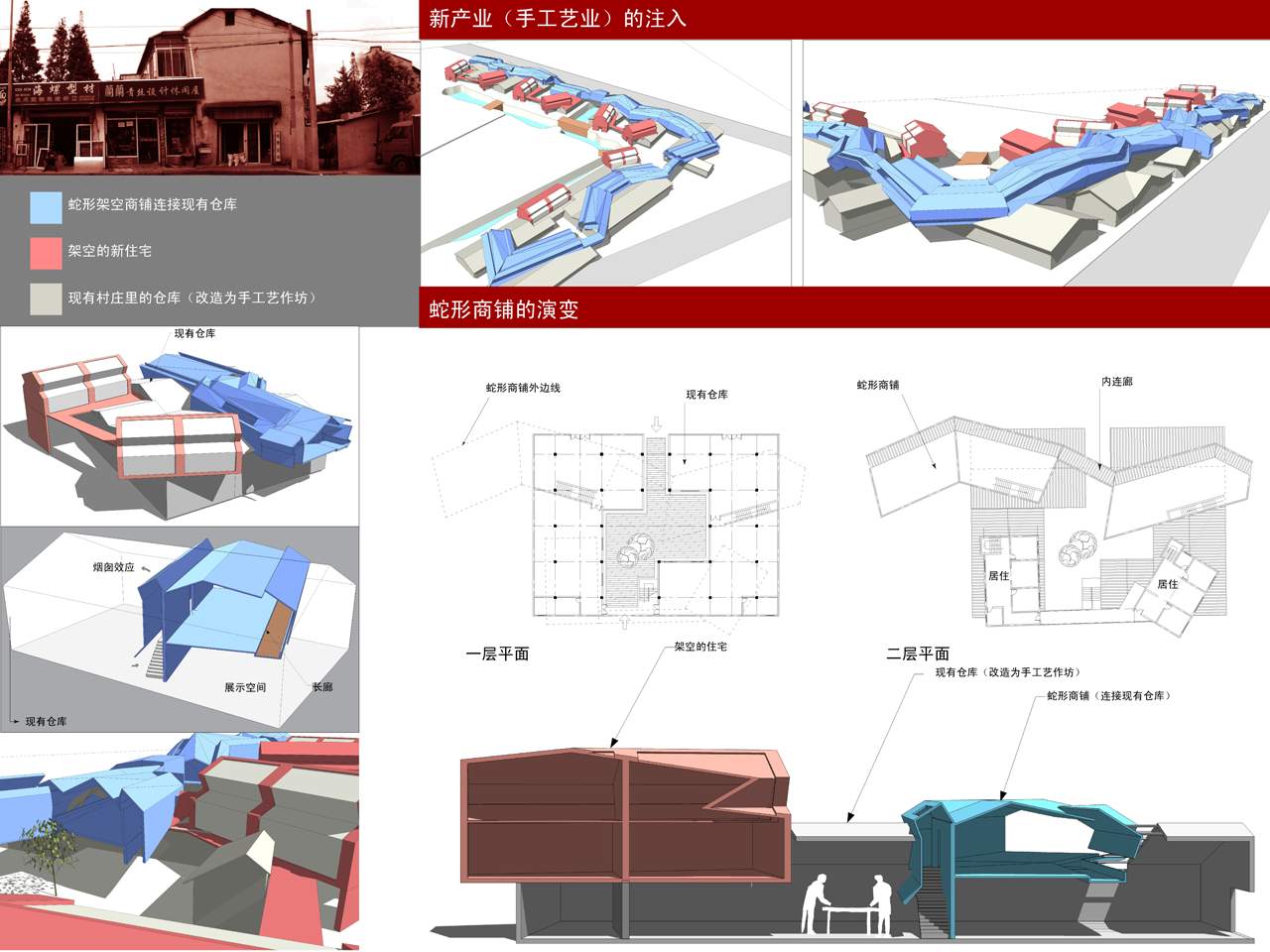 3、新产业(手工艺业)的注入:一个社区并不是以“居住”为主线条,以“配套”为副线条那么简单,社区的生动性是在于不同功能的有机混合。对于奄奄一息的都市村庄来说更需要有新的血液注入。这种新血液不光是在规划层面上的新社区,它必需给这一区域带来新的生活,新的价值,新的工作。上海的手工艺业似乎与在整个城市产业中也面临着同样的消极命运,不象六、七十年代,手工业在当今人们的生活中越来越疏远,逐渐被大专场或高档商厦中的名牌所代替。日用生活产品中极其缺乏以个体手工劳动的产品。比如在七十年代人们还能从鞋匠铺里买到人工制做的鞋,从金属加工铺里买得到手艺加工的金属制品,如今这种情况似乎已经不可能了。我们的消费能力消费质量确实提高了,但从另一个角度来看,我们的消费品种和我们的城市建设一样正在越来越趋于“非个性”,生产品与城市建筑一样变得缺乏地域特征,试想在意大利一些小商铺可以买到纯手工业的产品(如皮鞋、服装或玻璃制品等),他们的手工作坊没有消失,反而完全不同于大品牌产品,成为一种文化上的传承。上海在日趋国际化大都市的同时,好象缺乏了一些类似这类的“个性产品”。江南地区的手工艺业原本就很发达,那么在当今有没有新的空间策略来让它续继存活呢?有,虹中路地段的虹六村(或外环线带中的村庄)很适合做这类手工艺者的小作坊,因为个体的手工劳动作坊对空间的要求并不大。在新建架空层内原有房屋会形成“阴影区”(太阳射不到的区域)可以改造成不住人的人作坊(无环境污染的手工业)或小型展示馆(介绍本地区特征)。村民们可以通过政府或手工业协会的支持培训,聘请到各地的高技艺师傅,以师傅带徒弟的传承方式带动原住民学手艺,恢复村民们对自身劳动价值的信心,比如在引进师傅的同时,村民们已可参与开设以手工业为主的作坊(鞋店、裁缝店,宓匠店,木制品店甚至包括某些失传的手工技艺),村民们也可以将自己的房屋或村里的仓库租给这些手工艺者开设店铺,边学习,边收取租金,这带给了村民们新的就业机会和经济循环,也可满足周边新居民日常生活需求。使社区内形成自身劳动生产的消费链带;同时也吸引各地具有高技艺的手工匠人,促进手工业的复苏,使得某些具有传统文化的手工艺得以保留。