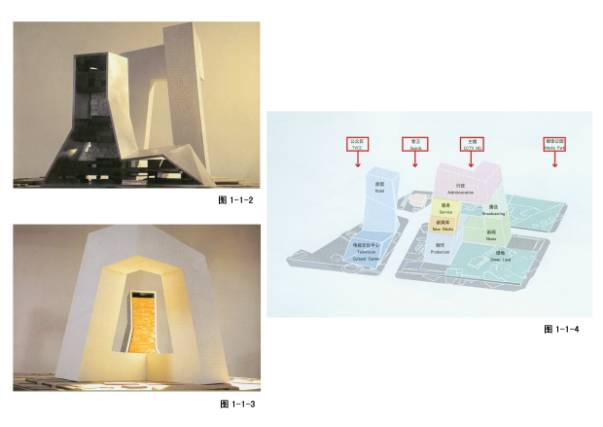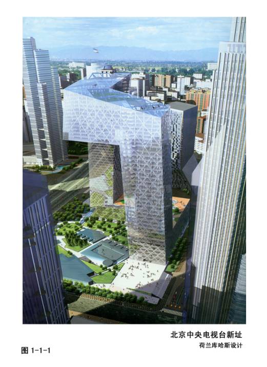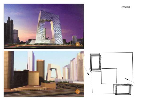 1—1—1~6中央电视台,荷兰大都会事务所库哈斯与上海华东院合作设计,55万平方米,高230米,50亿人民币投资。位于北京建外大街与三环路东北角。据说库当时也收到纽约邀请,最后选择了央视。由主楼和辅楼(电视文化中心)组成。造型特点:在180米的高空向外悬挑72米(约15层)建筑,另一方向悬挑约65米,形成高空对接,相互“握手”。