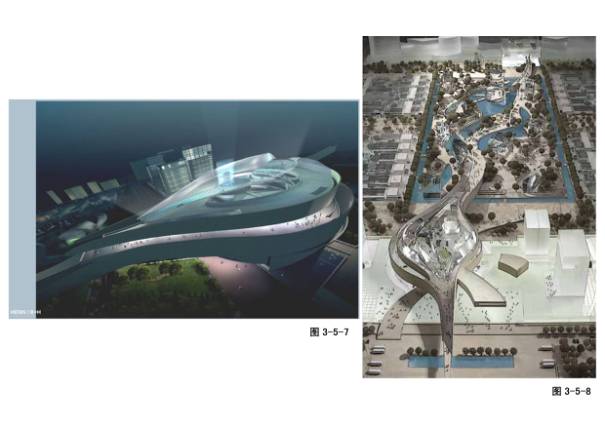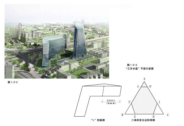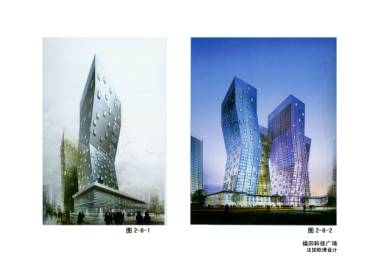 2-8-1~2福田科技广场设计方案,法国欧博设计公司。其理念是“跳舞的青年”、“滑板上的年轻人”,象征深圳年轻的城市充满活力、充满生机。柱网是垂直的平面错位,最大错位达9米。