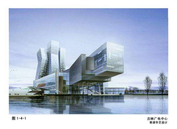 1-4-1吉林广电中心,香港华艺设计,辅助办公部分(四层)悬挑20米在水上。