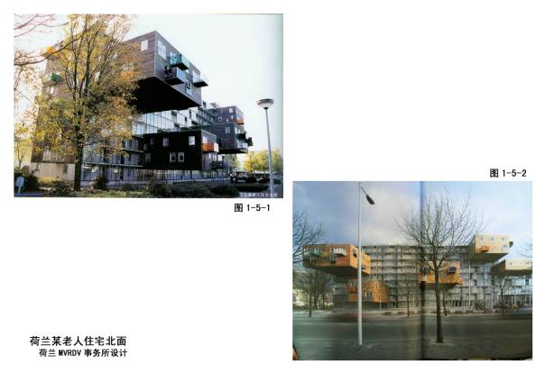 1-5-1~2荷兰阿姆斯特丹老人住宅,荷兰MVRDV公司设计,1997年建成。供100户55岁以上老人居住,因长方体块中只能放87户,还剩13户不想占绿地,采取悬挑方式。共悬挑5块,每块安排1-4户,悬挑长的达10米,用钢梁悬挑。里面的人走时还有轻微的颤动,似乎是对你胆量的挑战。