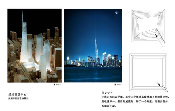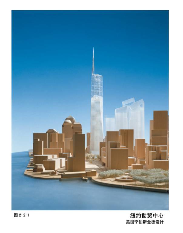 2—2—1~7纽约世贸中心(又称自由塔)重建方案,丹尼尔·李伯斯金德(美国籍波兰人,46年出生)设计。先后两轮国际投标,第一轮2002年初,推出6个方案,7月份在5000人的听证会上遭否决。后来在406份申请中选出七个建筑师做,共做出9个方案。2003年2月公布为中标方案并深入设计。