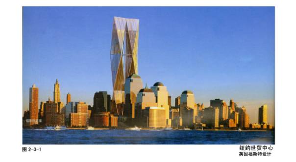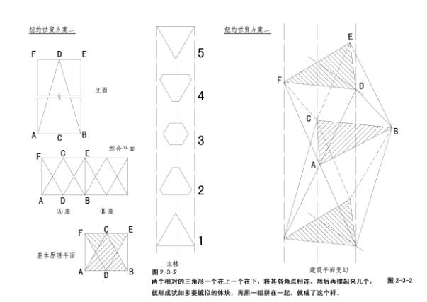 2—3—1~2纽约世贸中心福斯特方案:旋转的等边三角形三次叠加,叠加处的巨大平台作空中绿化。