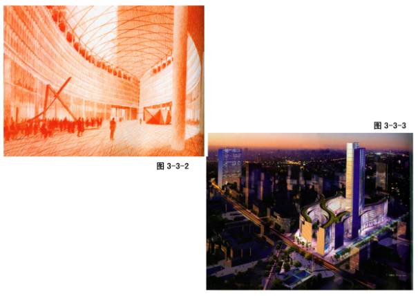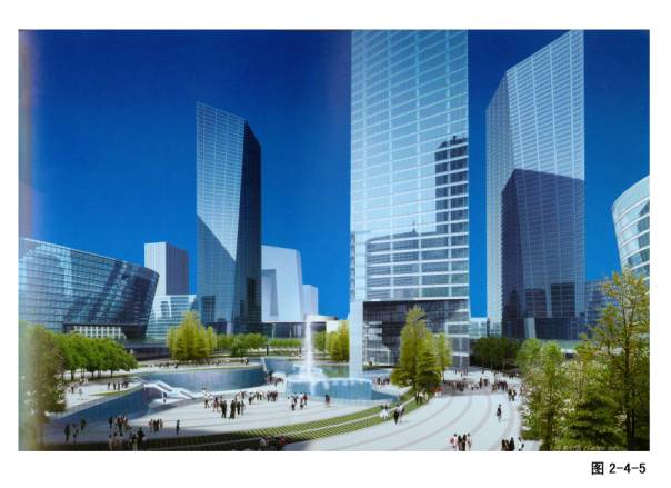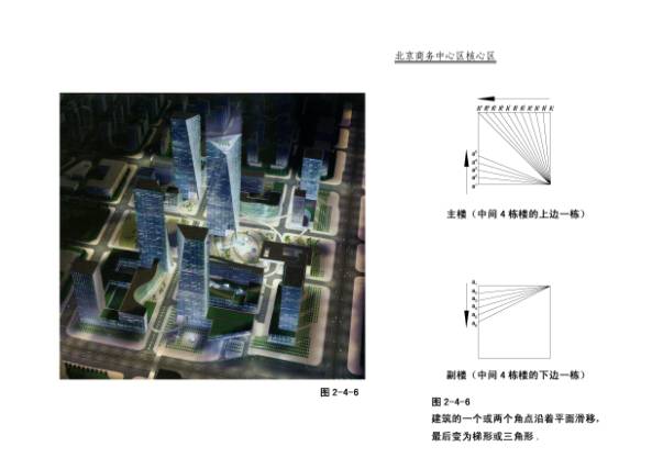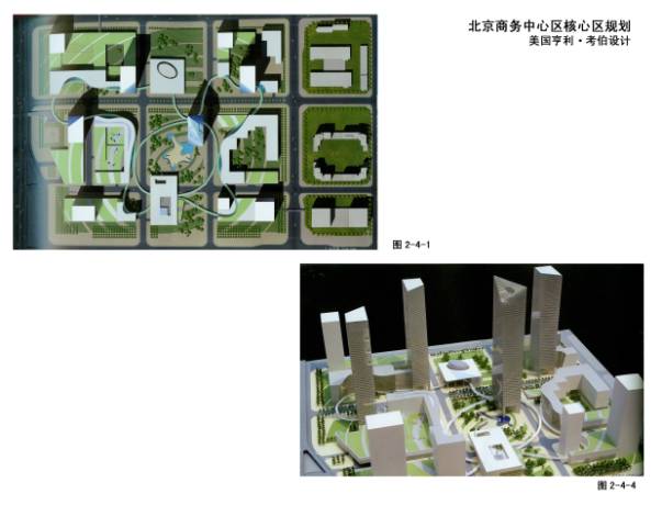 2—4—1~7北京商务中心区(CBD)核心区详细规划,亨利·考伯与中国建筑设计院合作设计。北京建路和东三环路交界处,38公顷,建面130万平米,容积率3.4。设计理念:中国的古代城郭规则的、秩序性很强的直角体系+中国传统园林自然界里的曲线和不规则形式→提出了中央公园和林荫大道,以此为基础布置了CBD核心区高层建筑群(10栋)。这些塔楼大部分设计成扭动的外观。主楼顶部设计了多层观景环廊,中间布置公共中庭。
