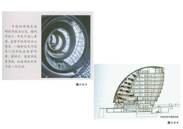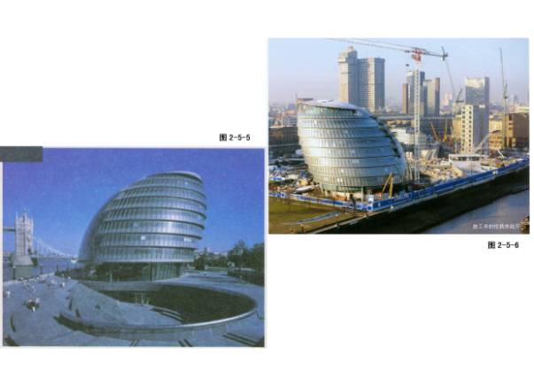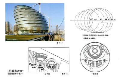 2—5—1~6伦敦市政厅,福斯特设计,英国伦敦泰晤士河边。产权是开发商,政府租用,35英镑/平米,以租代建,或许是政府支持房地产业的策略。设计了两年时间,施工16个月,我国正相反,所以修改不断。特点:平面不同大小的椭圆错位、向南倾斜、下沉式广场、中庭螺旋楼梯,开敞的办公室。