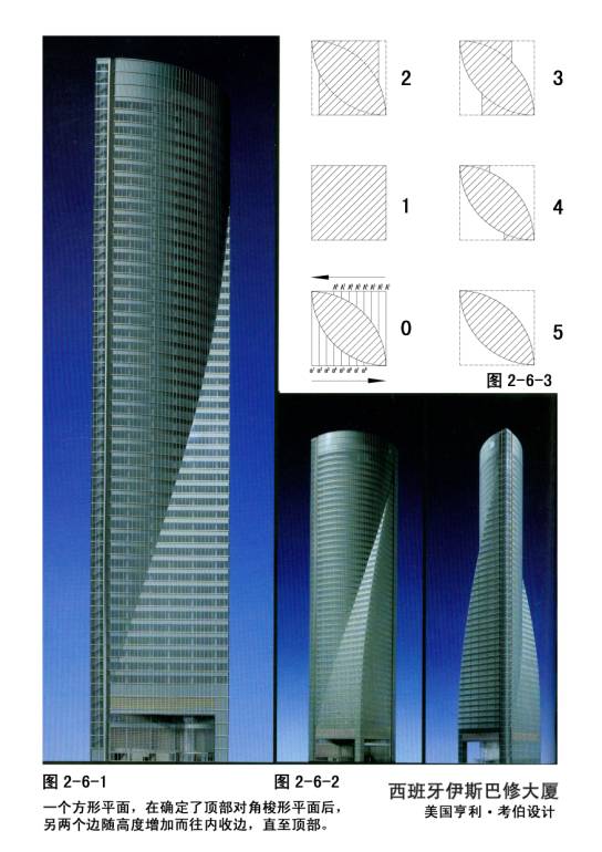 2—6—1~3伊斯巴修大厦,亨利·考伯设计,马德里,50层,在建。大厦平面由底下的方形开始到顶部变为一个梭形,每层平面、形状、大小都不一样,一般业主不会接受,马德里业主却热情接受。