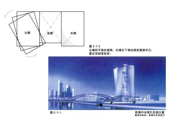 2—7—1~2欧洲中央银行总部大厦,奥地利库珀·希梅尔布劳设计,德国法兰克福市,20万平米,一座扭曲的塔楼,造成型极富活力,有一中庭,阳光直接射入,不同楼层营造的“空中花园”。2008年竣工。