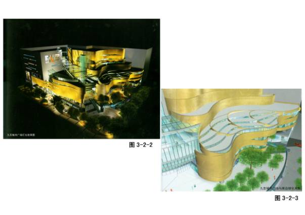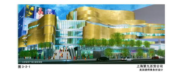 3—2—1~3上海第九百货城市广场,美国捷得建筑事务所与华东院合作设计。上海静安寺,9万平米,是静安区主力商厦,两种经营模式:大型综合百货,品牌专卖店。顾客的购物行为特征:一类、二类,众多的曲线、曲面及错退,建筑不显庞大压抑,而是充满活力、生机。