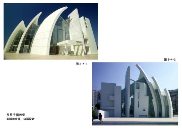 3-4-1~2罗马千禧教堂,美国理查德•迈耶设计。2003年竣工。特征:白色+双曲面弧形墙。白色本是迈耶建筑的标记,而弧形墙则是他二十五年前参观罗马文复及巴洛克建筑时教堂的椭圆或圆顶曲线给他的震憾所启发。三道墙强烈地使人领略宗教空间的神秘与神圣。