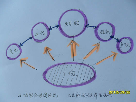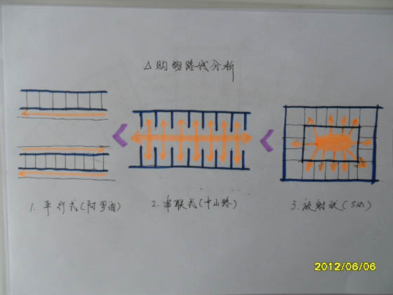 商业路线有很多种,我总结了一下:并列不如串联,串联不如放射状。俗话说:不怕不识货,就怕货比货,购物过程其实就是货比三家,寻找,对比,排除和选择的过程,购物路线也不是单向性的,是迂回往返的。你要让消费者逛到任何一家店后悔了,想折返回去买原来看中的那也是很容易的事情,一个路线要短,一个要好找。人在刚开始逛的时候会期待后面有更好的而不下手,逛到后面的时候会一直对比前面看到的,如果物美价廉就买了,如果不如前面的就想做回头客,但是路线设计不合理,让她觉得回去太遥远,不好找,她会想:真遗憾,回不去了,太累了,下次看到再买吧!那么今天你就损失了一个消费可能,而且消费者在这次购物行动中也没有满足欲望。