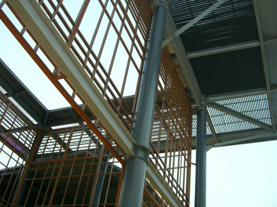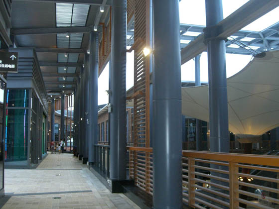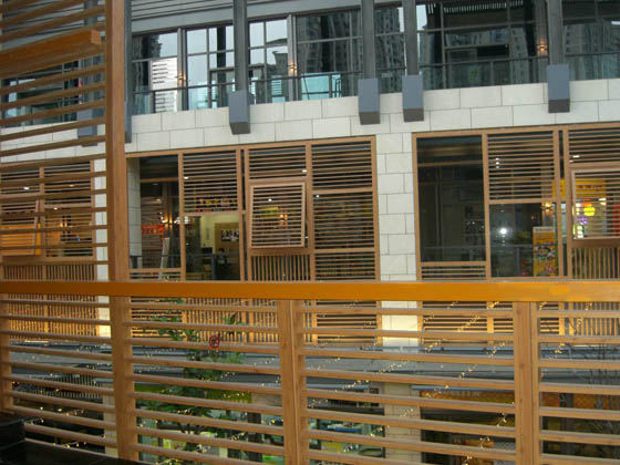 我在逛街的过程中,觉得那不断重复的黄色木构架让我很烦躁,触目所及都是门帘草席一样的横竖线条,密密麻麻,让我看不到商品,找不到路线,也让我的购物欲望大大降低,它除了是顾客和商品之间的屏障,不知道它在这个建筑中起了什么作用。耗费那么多的人力,物力做出来却是画蛇添足的一大笔。也许它想缓和一下建筑冰冷的色调,但是缓和的手段很多啊,需要得不偿失地这样做吗?