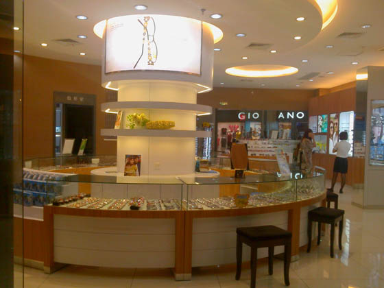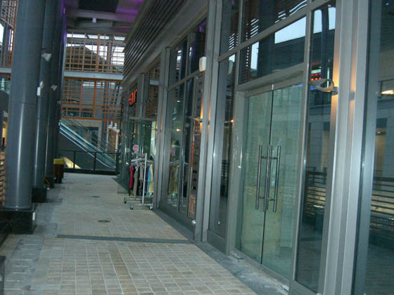 尤其是那个致命的灰蓝色橱窗玻璃,也许是出于风格统一和节能的要求而设计的,但是如果我是商家的话,我恨不得砸掉那面玻璃墙,换成无色透明的甚至直接换成卷帘门,因为我们那么辛苦地做广告,搞宣传,做活动不就是千方百计地吸引消费者的眼球,提高商品的面众率和店面的光顾率吗?可是那面灰蓝色的玻璃却把这一切努力都抹杀了,甚至让好不容易路过的消费者都看不到或者看不清楚商品懒得走进来而错过了,除非是目的性很强的人进来了会感叹:哦,里面还有卖这么多东西啊!