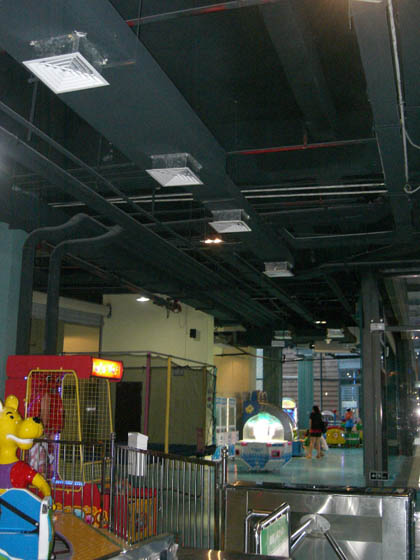 5,儿童游乐场的空间氛围不够明亮,愉悦,那么大的空间,为了省装修费用,用了原始的黑蓝色天花板,还把顶上乱七八糟的管道线路都涂刷成黑蓝色,暴露在外面,抬头一看,黑压压的,很乱很压抑。
