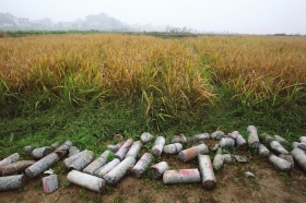 随着村民指引方向看过去,大片农田中散落着一堆堆长度不等的直径约3公分的麻石柱,这是岩土工程勘察时通过钻探设备采集的岩土样品。回龙村村民唐红辉说,这就是远大“施工”时留下的,“下半年的时候来过两批人,搞了差不多2个月的时间,在田里打了好多洞,都有六七十米深。”