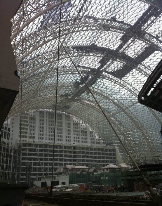 钢结构成了支撑建筑的主要材质,而顶棚大帽子的钢结构东西向跨度约为200米,高度约为100米,南北向跨度约为450米,这相当于一座大桥的跨度。它在旁边的空地上焊接了一年多时间,人多时有1500多名工人同时在作业,最少时也有500多人。焊接好的顶棚架构被平移至建筑旁,再由5辆吊车同时吊起罩上,合拢花费了约3天时间,最后拼接上玻璃。