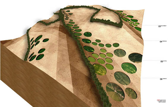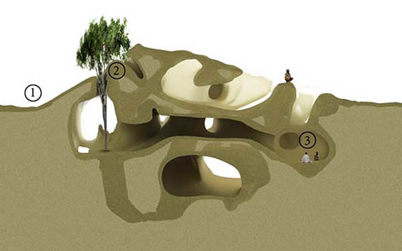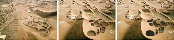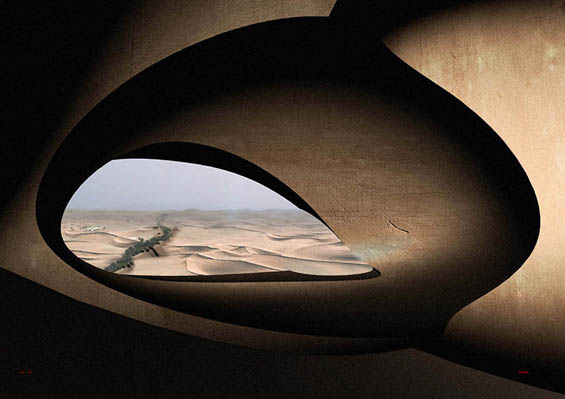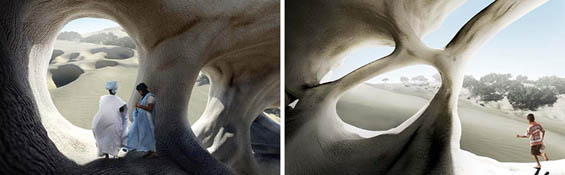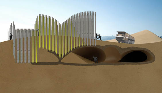 瑞典建筑师magnus larsson与最不可能的搭档在沙哈拉沙漠合作设计了一个长6,000千米的可居住沙岩墙,这个设计在empty quarter gallery的“sahara surreal”展览上展出。bacillus pasteurii这种细菌微生物在沼泽湿地中大量存在,在它的帮助下,松散的沙子将转变成纤维多孔的结构,能够可持续地控制沙漠化现象,同时为成千上万的难民提供住所。这个项目的关键在于如何将细菌和沙子转化成结构坚固的沙岩,UC-davis加州大学戴维斯分校正在利用犹他州的岩层对这一过程进行研究,用相同的原理在非常小的规模中进行实验。