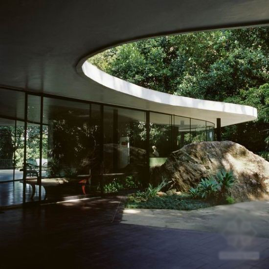 在150平方米的空间里开辟出一间以木质璧墙为基调的极简居所,热带雨林的火辣是这座优美建筑的主旋律,大胆曲线的使用又使其增添了一丝现代建筑的冷峻。尼迈耶通过这座居所实现了他心中的设想:一座内、外空间互相呼应,和谐融入大自然,同时还拥有完美曲线的建筑。