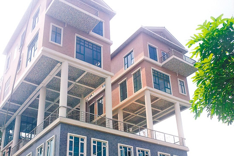 “空中别墅”位于东莞石碣镇和睦街。该栋建筑物外观装修奢华,结构分为两部分。“空中别墅”的下方是一栋高三层的厂房,在厂房的楼顶,由十几根水泥柱子将两栋别墅“撑起”。由于大门紧闭,记者无法进入该栋建筑物探访究竟,但透过门缝可以看到,里面仍堆放着大量装修材料。住在该栋建筑物内的一名女子称:“我只是打工的,具体情况要去问房管局。”