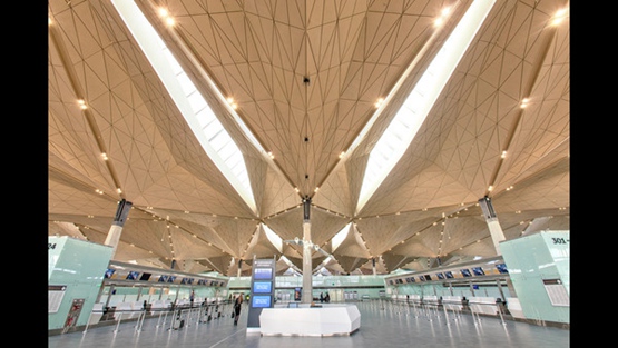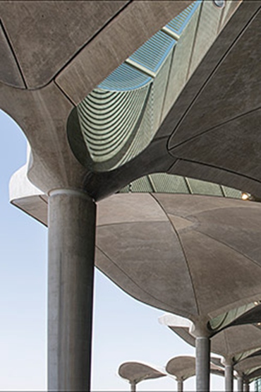 去年,该公司完成了约旦首都安曼的阿莉娅王后机场(Queen Alia airport),在半球形的太阳伞状的屋顶下面,有凉爽的空间。这种空间既能遮阳,又有很好的自然光线。
