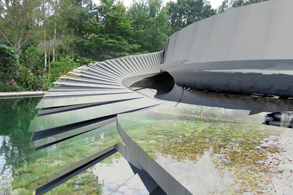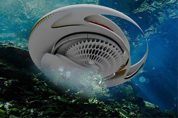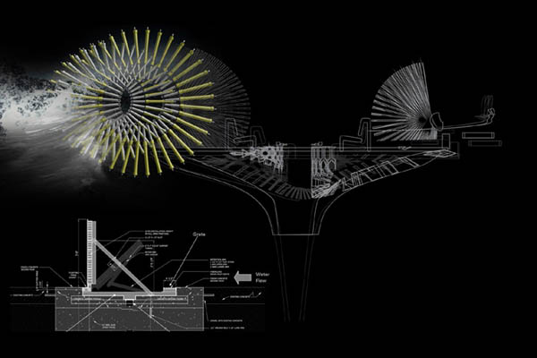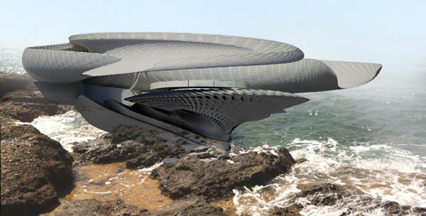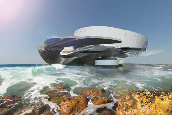 Margot Karasojevic事务所设计了一种水力发电的“潮汐能住宅”。住宅的地基嵌入到海岸沙石之中,可以利用海边的潮汐波浪能发电。建筑结构是由两个壳体组成:外部的壳体,由混凝土浇筑而成,将住宅锚固在海滩上;内部的壳体则随着潮汐涨落,在主框架内浮动。