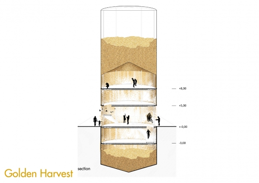 设计过程中,首要任务是创造一个与世博会主题息息相关的空间——给养地球。这一主题通过在空间内储存谷物——这一全地球最基本、最畅销的食品——而实现。种子是生命的象征,也是自我牺牲的文化象征。方案中的建筑主要有三个功能。除了它的信息功能外,它还“供养”着世博会的所有参与者。第三个功能则是告知时间。它还像一个象征世界资源流失的沙漏。建筑的基本形状是一个粮仓,里面也蕴含着信息。由于它是透明的,可以清楚看见时间流逝。
