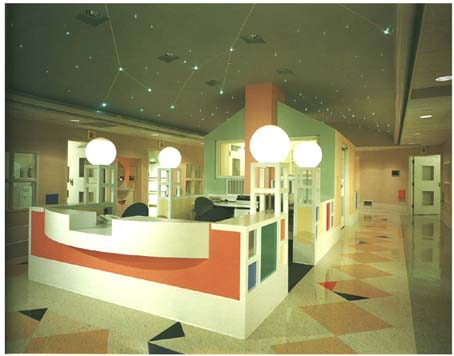门诊街内的“商店”——诊区设计可以各具特点。例如:儿科门诊“店”,(图22)打破以往与成人诊室条件相仿的格局,打开了砖石结构的间壁墙,取而代之以由三角形、圆形、方形等不同拼图组成的色彩缤纷的木制拦板,墙上挂钟猫头鹰的黑眼睛是转动的,玻璃鱼缸里的金鱼在水草中戏游,动听的风铃,电视里播放着动画片《狮子王》,滑梯、电马……都吸引着在这里就医的小天使,他们得到了穿粉色制服的护士阿姨的精心照顾,寓看病于娱乐之中,使患儿留连忘返,以为到了游乐场,情绪放松便于诊治,从而改变了病儿哭闹不止、不配合医疗的无奈就医状况。