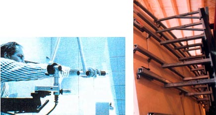 右图 我在Frank Gehry 的辨公室内看到这个原大样品,上面的每块石都是从用计算机得来的数据剪裁的,后面的构架完全为了服务它立体的外皮。